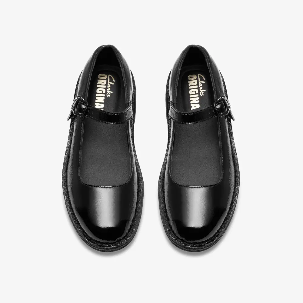 Wir präsentieren das Patent Pack, eine atemberaubende Kollektion, die die Eleganz von geknacktem Lackleder in ikonischen Silhouetten präsentiert: Der Desert Jane. Entworfen für alle, die zeitlosen Stil mit einem modernen Touch schätzen. Der Desert Jane besticht durch ein luxuriöses Obermaterial aus geknacktem Lackleder, das das Licht wunderschön einfängt und eine einzigartige Textur und einen besonderen Glanz bietet. Der Metallschnallenverschluss sorgt für sicheren Halt, während der silberne Metallanhänger am Riemen ein schickes Detail hinzufügt, das die raffinierte Ausstrahlung unterstreicht. Die glatte, schwarze Kreppsohle bietet Komfort und Flexibilität für ganztägigen Tragekomfort. Genießen Sie die elegante Ästhetik von weichem, geknacktem Lackleder und bereichern Sie Ihre Schuhsammlung mit diesem vielseitigen Modell.
