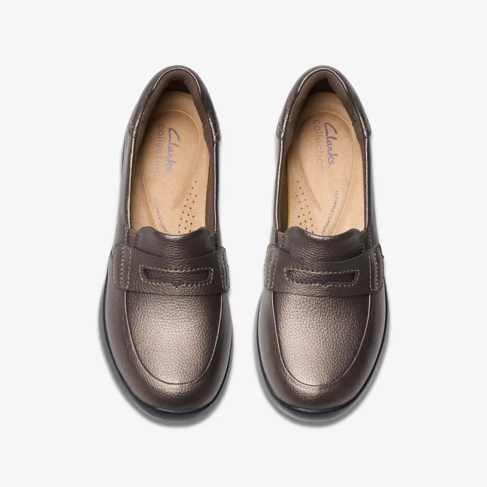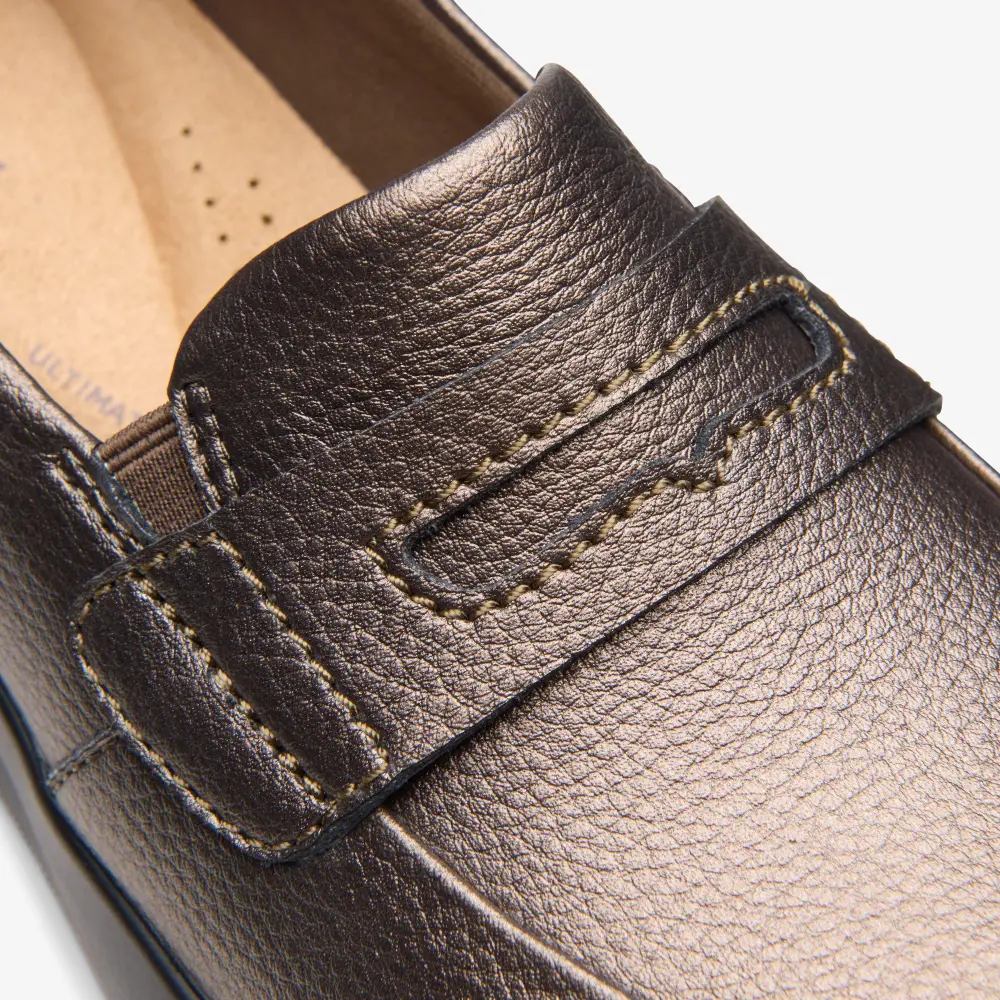 Der Slipper Ellowyn Penny kommt in einem vielseitigen Metallic-Bronze-Ton und passt zu jedem Look. Die griffige, keilförmige Gummisohle sorgt für ein flexibles und freies Laufgefühl, während das superweiche Schaumstoff-Fußbett den Tragekomfort bei jedem Schritt erhöht. Ein bewährter Favorit – der klassische Loafer sieht in dieser Saison besser aus denn je.