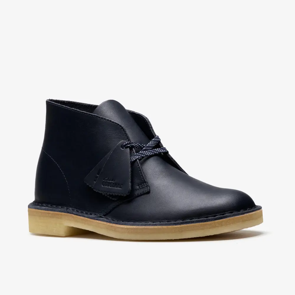 Kulturelles Prestige und Design-DNA: Kein Schuh ist wie der Clarks Originals Desert Boot. In den 50er-Jahren geboren, löste sein minimalistischer, progressiver Stil eine weltweite Schuhrevolution aus. Und jedes Designdetail ist bis heute dem ersten bahnbrechenden Paar treu geblieben. Die klaren, präzisen Linien des Stiefels werden durch hochwertiges marineblaues Leder unterstrichen und mit einem unkomplizierten Schnürverschluss abgerundet. Die authentische Kreppsohle vervollständigt diese unverwechselbare Silhouette. Sofort erkennbar, für immer ikonisch. Ein echtes Original.